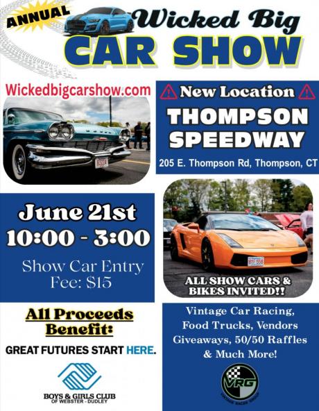Calling all car enthusiasts! Mark your calendars for June 21st from 10:00 AM to 3:00 PM and head to the newly located Thompson Speedway at 205 E. Thompson Rd, Thompson, CT, for the Annual Wicked Big Car Show. Whether you’re a die-hard gearhead or just love a good time with family and friends, this event is not to be missed!