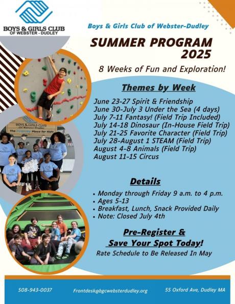 The Boys & Girls Club of Webster - Dudley is a licensed childcare serving children ages 5-13, offering a comprehensive summer program with engaging activities, meals and field trips. We are committed to making our programs accessible, offering generous financial aid and scholarships, accepting vouchers and providing payment plans. For further information or to enroll your child, please call us at 508-943-0037.